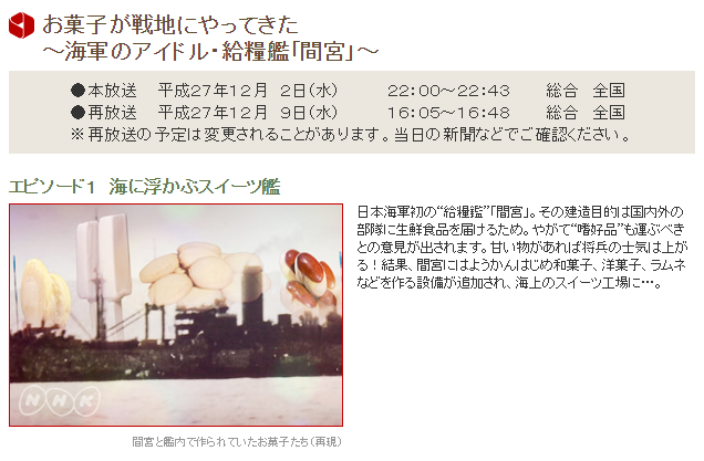 ホーム>>【艦これ】NHK 歴史秘話ヒストリア『お菓子が戦地にやってきた ~海軍のアイドル・給糧艦「間宮」~』の再放送は12/9 16:05から!! 他